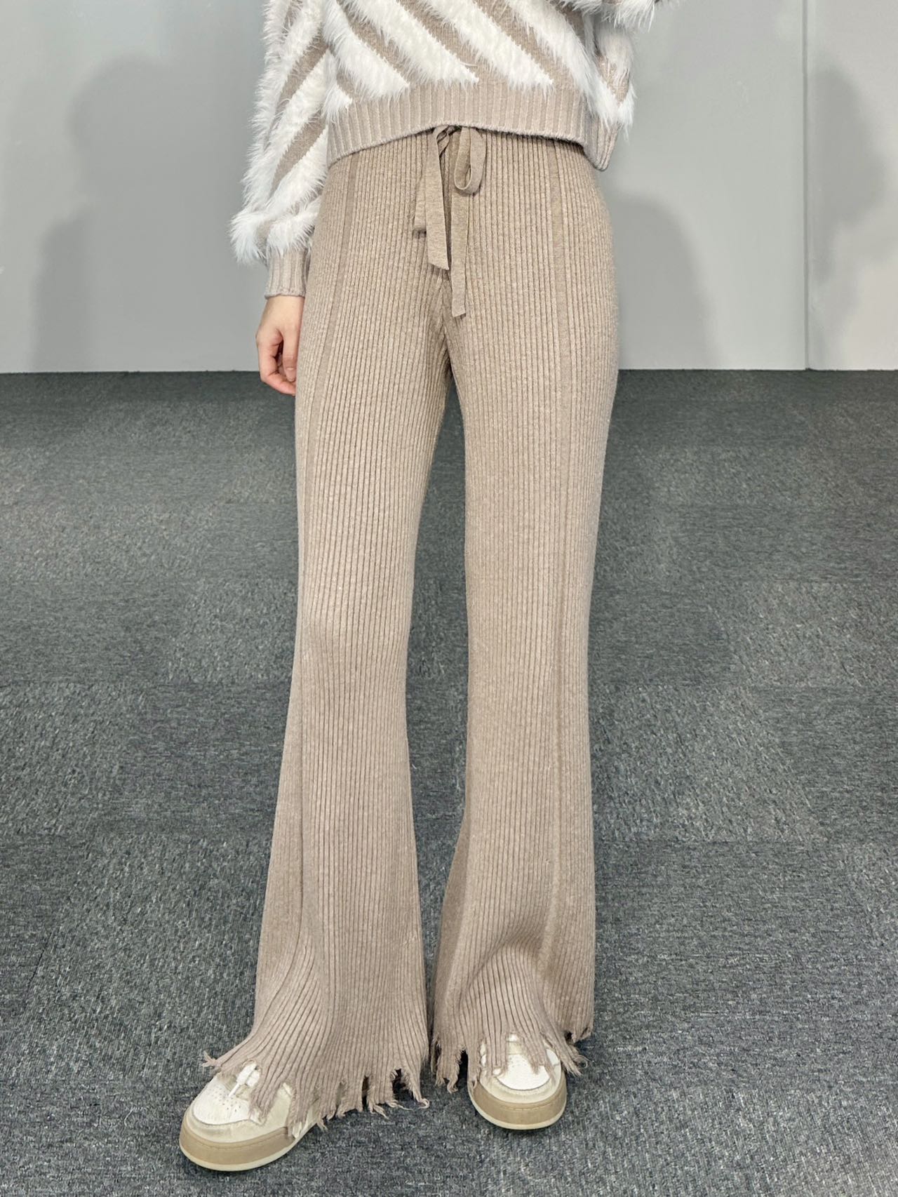 High Waist Straight Leg Belted Tattered Bottom Knit Pants in Beige