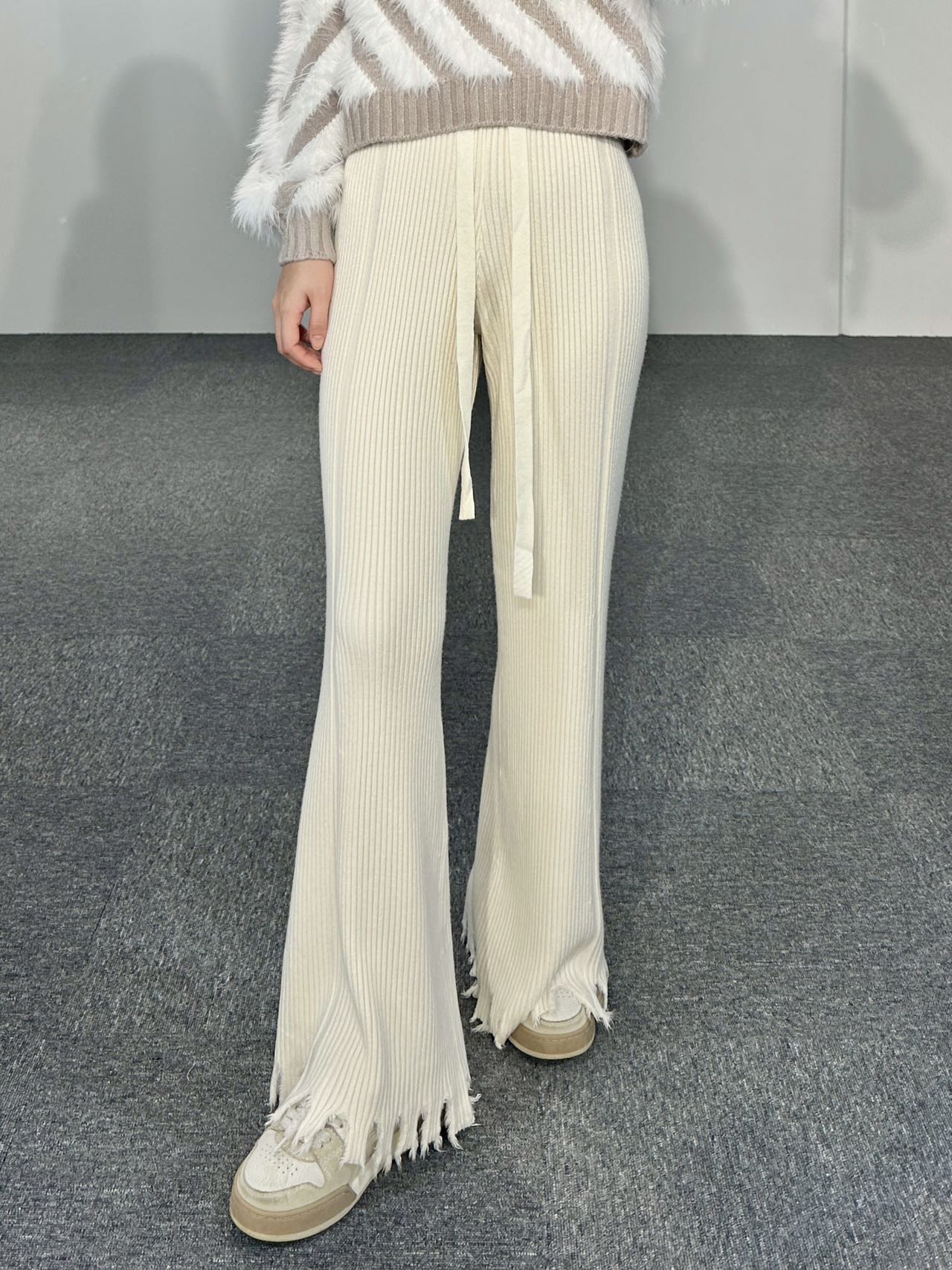 High Waist Straight Leg Belted Tattered Bottom Knit Pants in Cream